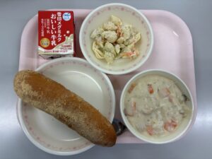 11月12日(水)の給食 今日の給食 2025.11.14 きなこパン、牛乳、マカロニサラダ、クリームシチュー 精華町内の中学3年生に好きな給食のアンケートをとりました。今月はその中で人気だった給食が順番に登場します。今日は精華中学校でリクエストが多かった献立です。勉強にスポーツ、成長期で食欲旺盛な中学生にぴったりなボリューム満点献立です。 Post Views: 25