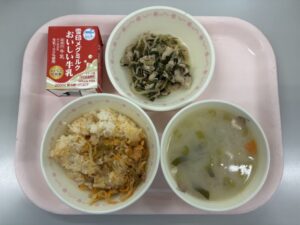 11月13日(木)の給食 今日の給食 2025.11.14 キムタクごはん、牛乳、にらもや炒め、トッポギスープ にらの香りは、「アリシン」という成分で、ビタミンB1 の吸収をよくしてくれる働きがあります。ビタミンB1は、豚肉や豆類に多く含まれ、疲労回復効果があると言われています。今日の給食 の「にらもや炒め」に、豚肉とにらが入っています。しっかり食べて、元気チャージしてくださいね。 Post Views: 36