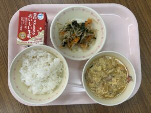 11月25日(火)の給食 今日の給食 2025.11.26 ごはん、牛乳、木の葉丼の具、ほうれん草のごま和え 木の葉丼は玉子丼の仲間です。主に関西 で食べられており、かまぼこが木の葉の形に見えるのでこの名前がつきました。薄く切ったかまぼこやネギが彩りに使われることが多いです。いちょう切りにしたにんじんやかまぼこが秋の紅葉を感じさせますね。今日はどんぶりなのでごはんにかけて食べましょう。 Post Views: 18