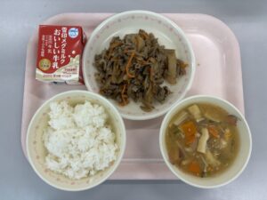 12月11日(木)の給食 今日の給食 2025.12.12 ごはん、牛乳、五目きんぴら、さつまいものみそ汁 五目きんぴらの「五目」とは、五つの具材が入っているという意味ではなく、たくさんの具材が入っているという意味です。「きんぴら」は、江戸時代の歌舞伎の登場人物「金平」から来ていてます。金平は、歌舞伎で力持ちのヒーローとして描かれていますが、きんぴら料理にも力強くて元気が出る料理という意味が込められています。 Post Views: 13