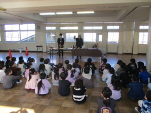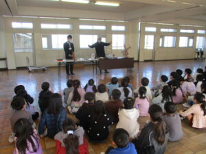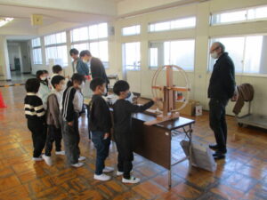 糸車体験(1年生) 1年生 2025.12.16 12月16日(火)、国語の授業で学んだ『たぬきの糸車』に関連して、糸車体験を行いました。山城郷土資料館の方をお招きし、昔の暮らしや糸車の仕組みについてお話を聞いたあと、実際に体験をしました。子どもたちは、糸車の回る音や手触りに興味津々で、「むずかしいけど楽しい!」「昔の人はすごいな」といった声があがり、作品の世界をより深く感じることができました。今回の体験を通して、教科書の物語と現実の道具がつながり、学びが広がりました。貴重な体験をありがとうございました。 Post Views: 21