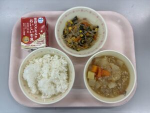 12月15日(月)の給食 今日の給食 2025.12.17 ごはん、牛乳、しらたきのツルツルいため、大根のそぼろ煮 しらたきは、こんにゃくを糸のように細いひも状にしたものです。その様子が滝のように見えるので、白滝と名づけられました。こんにゃくは、「こんにゃくいも」という芋からできる食べ物です。ほとんどが水でできていますが、グルコマンナンという食物繊維がおなかの調子を整えてくれます。今日は、ベーコンやコーンと炒めています。ツルツルとした食感を味わってください。 Post Views: 12