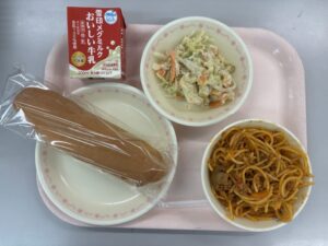 12月17日(水)の給食 今日の給食 2025.12.19 小型パン、牛乳、マリオも大好きミートスパゲティ、ごまマヨサラダ 今日は、食育の日献立です。今月は、スーパーマリオに登場する「マリオ」が大好きな、スパゲティを使った「ミートスパゲティ」です。ミートソースには、ひき肉と、たまねぎ、にんじん、セロリ、にんにく、しょうがなどのたくさんの野菜が使われています。マリオのように力いっぱい活動するためにも、しっかり食べてパワーをチャージしましょう! Post Views: 14