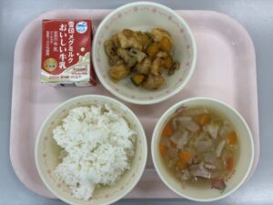 12月22日(月)の給食 今日の給食 2025.12.23 ごはん、牛乳、鶏肉と野菜の甘からあげ、ゆずの香りスープ 今日は、「冬至」にちなんだ献立です。昼の時間が一年で一番 短いとされる日で、この日に「ん」が2つつく食べ物を食べると、「運」がつき、元気に過ごせるという風習があります。今日の給食 には、甘辛揚げに「なんきん(かぼちゃ)」や「れんこん」を使っています。スープには冬至と関係の深いゆずも入っているので、しっかり食べて寒さに負けず過ごしましょう。 Post Views: 7