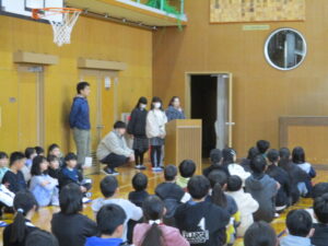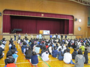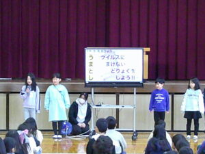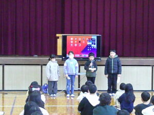 全校朝の会(1月) 1年生 2026.01.14 1月14日(水)、1月の全校朝の会を行いました。始めに、3年生が12月の生活目標の振り返りについて発表しました。その後、2年生が今月の生活目標を発表しました。1月の目標は、「ウイルスに負まけない努力をしよう!」です。自分たちで考えた目標を達成することにより、みんなが楽しく笑顔で過ごせる東光小学校にしようと頑張っています。 Post Views: 55
