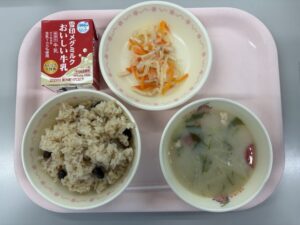 1月15日(木)の給食 今日の給食 2026.01.16 黒豆ごはん、牛乳、お雑煮、大根のさっぱり和え おせちのひとつひとつの料理には、1年の始まりを祝う、縁起の良い意味や願いが込められています。今日の黒豆ご飯の黒豆には、「まめに働く」という意味があります。また雑煮は地域で味やおもちの形が違います。給食は白みそ仕立ての京都のお雑煮です。白玉が入っているので、よくかんで食べましょう。 Post Views: 36