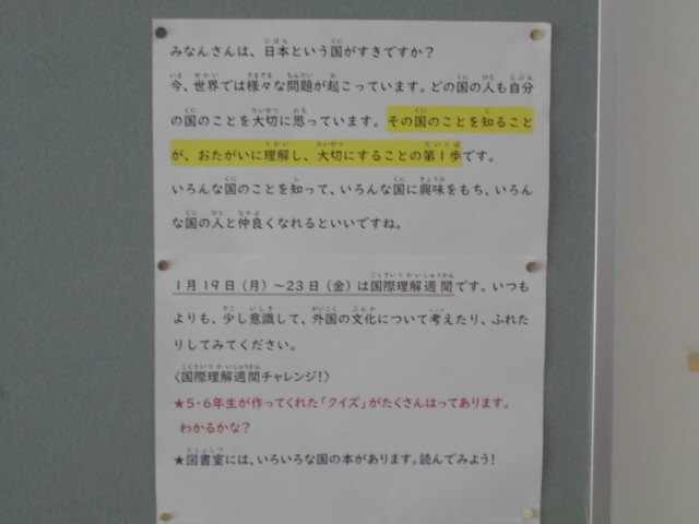 「国際理解週間」 1年生 2026.01.22 1月19日(月)からの一週間は、本校の「国際理解週間」として位置付け、全校で国際理解教育に取り組んでいます。各学年の発達段階や学習内容に応じて、世界の様々な国や地域の文化、生活習慣、価値観の違いなどについて理解を深める活動を行います。活動を通して、多様性を尊重する心や、異なる文化をもつ人々と共によりよく生きていこうとする態度の育成につなげていきます。本週間での学びを、今後の学習や日常生活の中で生かし、広い視野をもって物事を考えられる児童の育成を目指します。 Post Views: 60