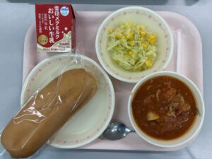 3月4日(水)の給食 今日の給食 2026.03.09 味付けパン、牛乳、トマト煮込み、キャベツとコーンのサラダ トマトは南アメリカのペルーという国で生まれました。はじめは見て楽しむだけで、食べられていなかったそうです。今では、夏においしい野菜のひとつとして親しまれています。一年中楽しめるようにビニールハウスを使って育てたり、収穫したトマトを缶詰やケチャップなどに加工されたりしています。今日はトマトの缶詰を使って豚肉やじゃがいもと一緒に煮込みました。 Post Views: 20