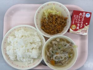 3月12日(木)の給食 今日の給食 2026.03.12 ごはん、牛乳、タコライスの具、添えキャベツ、ビーフンスープ ビーフンは、米から作った麺です。ツルツルとした食感がおいしいですね。米は、そのまま炊いてごはんとして食べるだけでなく、餅や団子、せんべいなど、いろいろな食べ物になって、わたしたちの食生活を支えています。最近日本では、作られる生産量も食べられる消費量も減ってきてしまっていますが、日本人の食事には欠かせない穀物です。 Post Views: 21