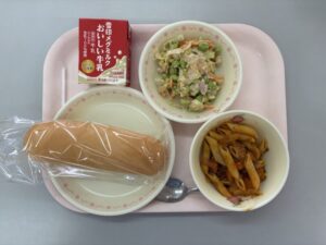 4月27日(月)の給食 今日の給食 2026.04.28 小型コッペパン、牛乳、ペンネのミートソース、豆サラダ ペンネはパスタの一種で、イタリア語でペンという意味です。ペン先のように両端を斜めに切った筒状のパスタで、形がペンに似ていることからこの呼び方になりました。穴が空いているのは、生地を作る時に早く乾燥させるためと、火のとおりを早くするためです。 Post Views: 20