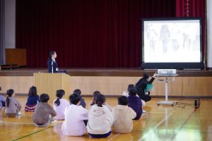 一列ずつ交互に座り、東西の児童がペアやトリオになるようにして交流しました。