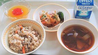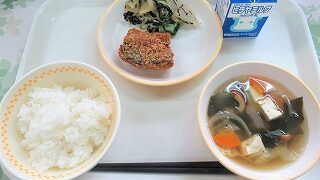 ごはん、玉ねぎと芋の甘辛煮、ほうれん草のこんぶ和え、米粉の黒糖ケーキ、牛乳