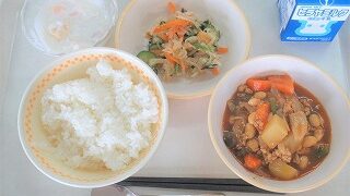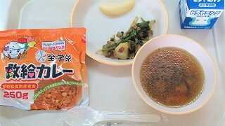 【防災給食】救給(きゅうきゅう)カレー、ジャーマンポテト、豆腐のスープ、リンゴ、牛乳