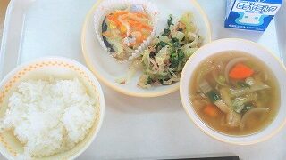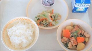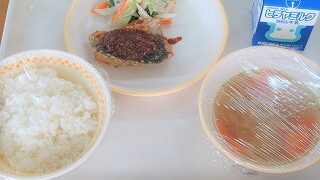 ごはん、ヤナギのごまケチャップソースがけ、ツナマヨサラダ、大豆とさつまいものスープ、牛乳