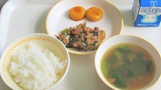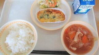 ごはん、かぼちゃとベーコンのキッシュ、切干大根のサラダ、トマトスープ、牛乳