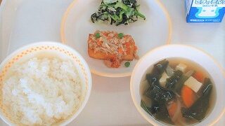 ごはん、サワラのみそマヨネーズ焼き、キャベツのおかか和え、白菜のすまし汁、牛乳