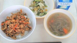 スパイシーそぼろごはん、海藻サラダ、春雨スープ、牛乳