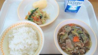 【目の愛護デー】ごはん、玉ねぎと芋の甘辛煮、中華サラダ、ブルーベリーの米粉ケーキ、牛乳