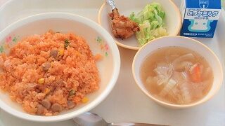 【クリスマスメニュー】ケチャップライス、チューリップのから揚げ、添え野菜、白菜のスープ、牛乳 ★2学期最後はクリスマスメニューでした。チューリップのからあげの「チューリップ」とは、鶏の手羽元の肉を骨に沿っ...