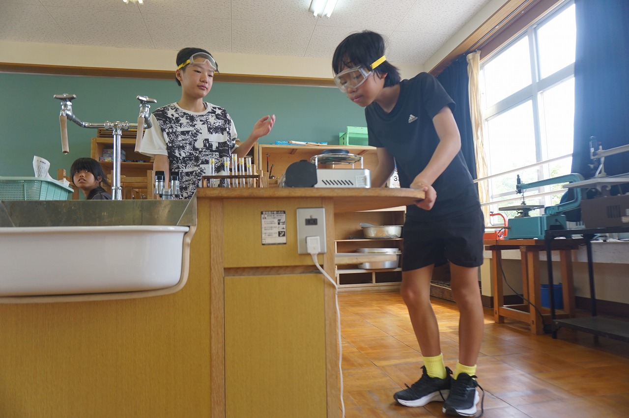 水溶液の実験を行いました。バーナーで温めるとどのような変化が起こるか、様々な水溶液で実験しました。変化した様子に驚く場面もあり、仮説を立て、それを実験で立証してみる。そして仮説と結果を踏まえて、考察を行う。そういうリアルな体験が子どもたちの新たな学びとなっていきます。
