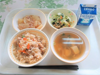 11月21日(金)の給食 給食室より Twitter Facebook はてブ Pocket LINE コピー 2025.11.21 【和食の日】鶏ごぼうごはん、大根のそぼろ煮、白菜の炊いたん、ゆばのすまし汁、牛乳 Post Views: 23