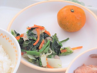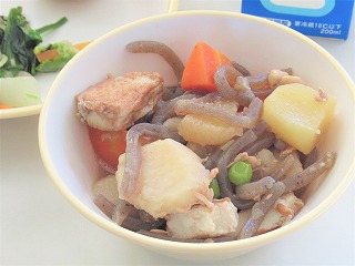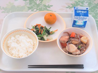 【みやづ食の日】ごはん、山の芋と鶏肉の甘辛煮、切干大根のオイスターソース炒め、果物(由良みかん)