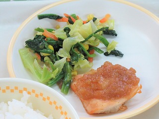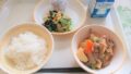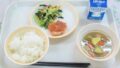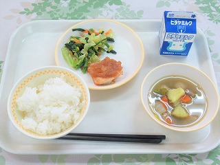 【みやづ食の日】ごはん、鶏肉のオニオンソースがけ、ほうれん草のサラダ、さつまいもとれんこんのスープ、牛乳