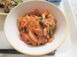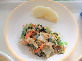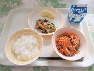 ごはん、ポークビーンズ、切干大根の中華炒め、果物(リンゴ)、牛乳