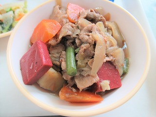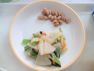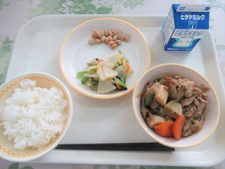 【給食週間 滋賀県メニュー】ごはん、豚肉と赤こんにゃくの煮物、はくさいの酢の物、きなこ豆。牛乳