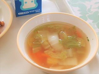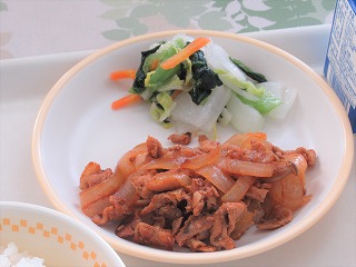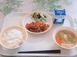ごはん、ポークチャップ、フレンチサラダ、さつまいものスープ、牛乳