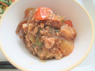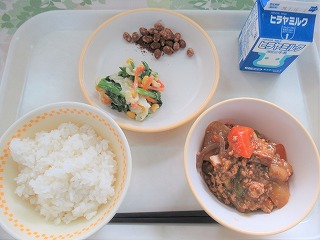 ごはん、大根のそぼろ煮、マヨネーズサラダ、ココア豆、牛乳