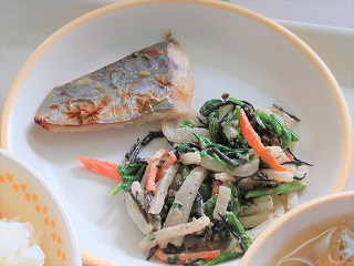 ごはん、サワラの西京焼き、ほうれん草とひじきのごまサラダ、白菜のすまし汁、牛乳