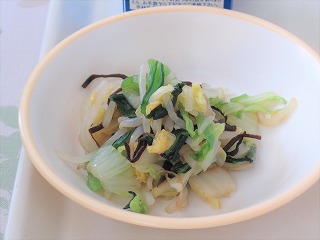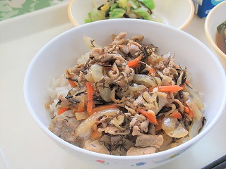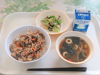 もりもり切干大根入り豚丼、白菜の塩昆布和え、歴史のつまったみそ汁(吉津小6年生考案メニュー)、牛乳
