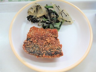 ごはん、サバのフライ、のりのり大根、知恵の輪黒チクワのすまし汁(栗田小6年生考案メニュー)、牛乳