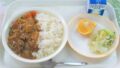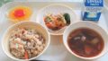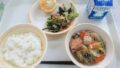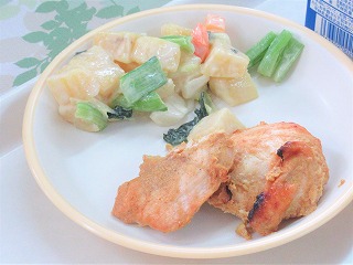 ごはん、タンドリーチキン、さつまいもサラダ、白菜のスープ、牛乳
