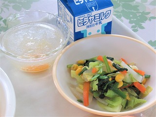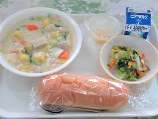 コッペパン、鶏肉と白菜のクリームシチュー、フレンチサラダ、サイダーゼリー、牛乳