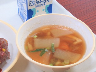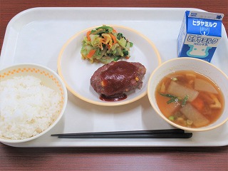 ごはん、手作りハンバーグ、はくさいのかつお和え、大根のみそ汁、牛乳