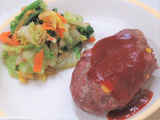 手作りのハンバーグは、給食室で一つひとつ形を整えて焼いているので、中はふっくら、外は香ばしく仕上がっています。また、ハンバーグが今日のように家庭でも学校でも定番のおかずになったのは、実は日本で独自に進化した「洋食文化」が広がったからといわれています。子どもから大人まで大人気の料理ですが、栄養のバランスがとれた献立と一緒に食べることで、もっと健康的に楽しめます!