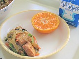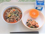 世屋味噌コーンバターラーメン(1年生リクエスト)、厚揚げのピリ辛炒め、果物(由良みかん)、牛乳