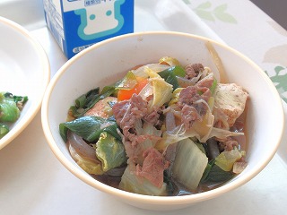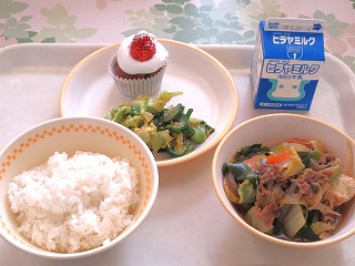 ごはん、すき焼き風煮、キャベツのおひたし、米粉のチョコケーキ、牛乳
