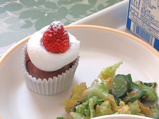 ★今日の給食テーマは「春のめぐみを味わう和スイーツの日」。米粉で作ったチョコケーキの上に旬のいちごがのり、やさしい甘さの中に季節を感じられる一品です。すき焼き風煮やキャベツのおひたし、ごはん、牛乳とあわせて、和の味わいと春らしい彩りを楽しめる献立になっています。