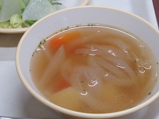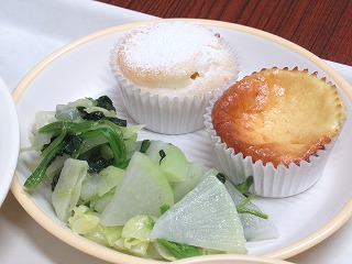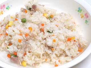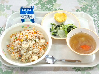 ベーコンと野菜のピラフ、ドレッシングサラダ、コンソメスープ、ベイクドチーズケーキ、牛乳