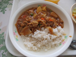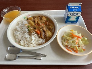 カレーライス(麦)、大根のサラダ、オレンジゼリー、牛乳