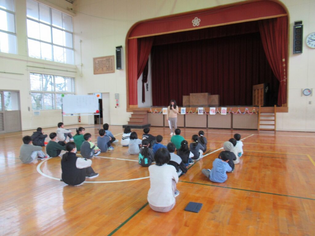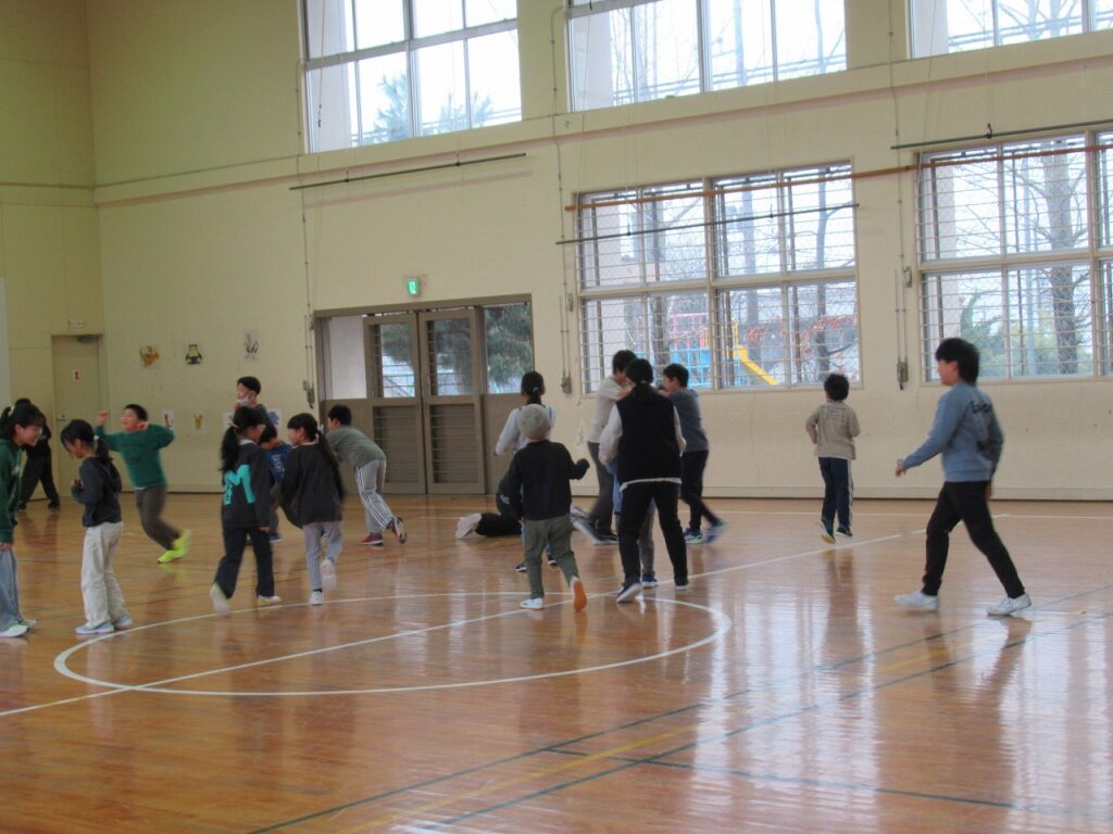 自己紹介で「なりたい職業」を発表した時には、上級生から「へぇ~」や「お~っ!」等の反応もありました。全校遊びでは、じゃんけんの勝ち負けに一喜一憂したり、必死でオニから逃げる様子等が見られ、和気あいあいとした雰囲気で楽しい時間を過ごしました。