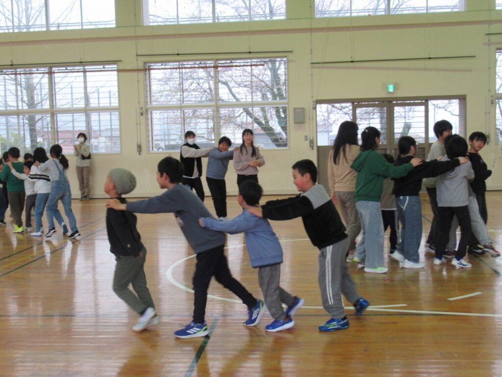 新入生の自己紹介から始まり、全校遊び「じゃんけん列車」と「こおりオニ」をして交流を深めました。