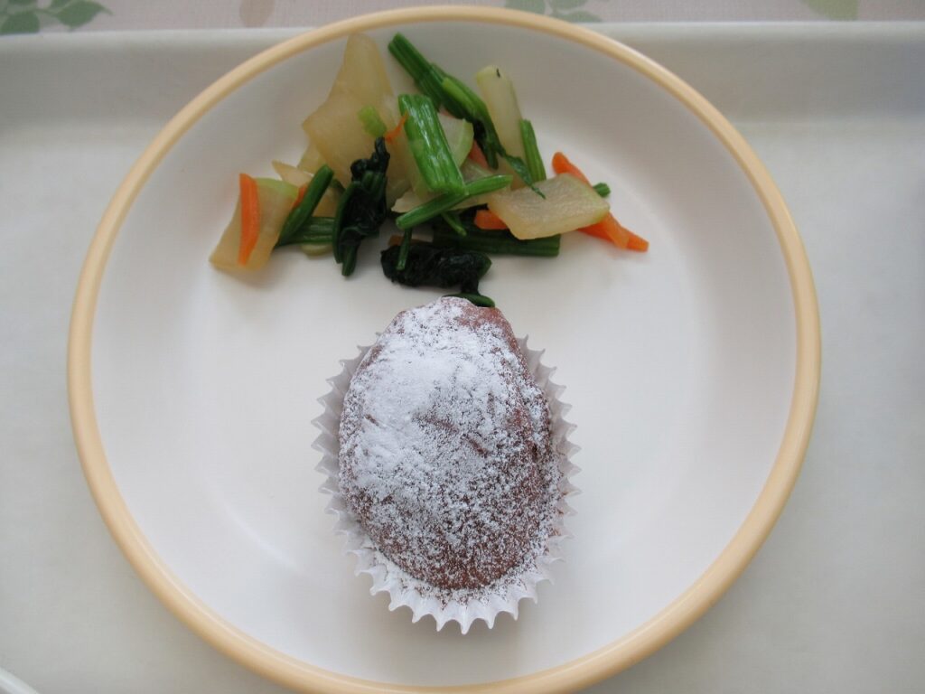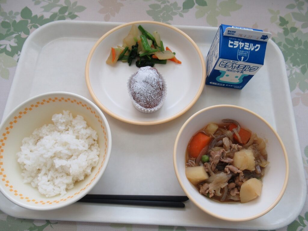 ごはん、肉じゃが、ほうれん草のおひたし、米粉のチョコケーキ