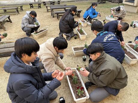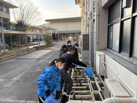 先日の放課後に1年生の環境委員が花の植え付け作業をしました。学校で作っている有機肥料と、雨水や地下水を使って栽培しています。春になったら地域の施設に寄贈する予定です!