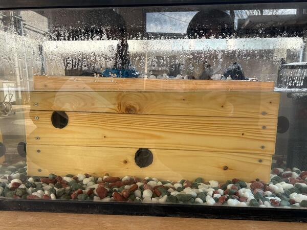 渡り廊下のスペースに新しい生き物が増えました。たまに顔を出してくれますが、このタイミングでは隠れていました。ニョロニョロした生き物です。この住処は教員の手作りです。生徒も教員も生き物が大好きです。