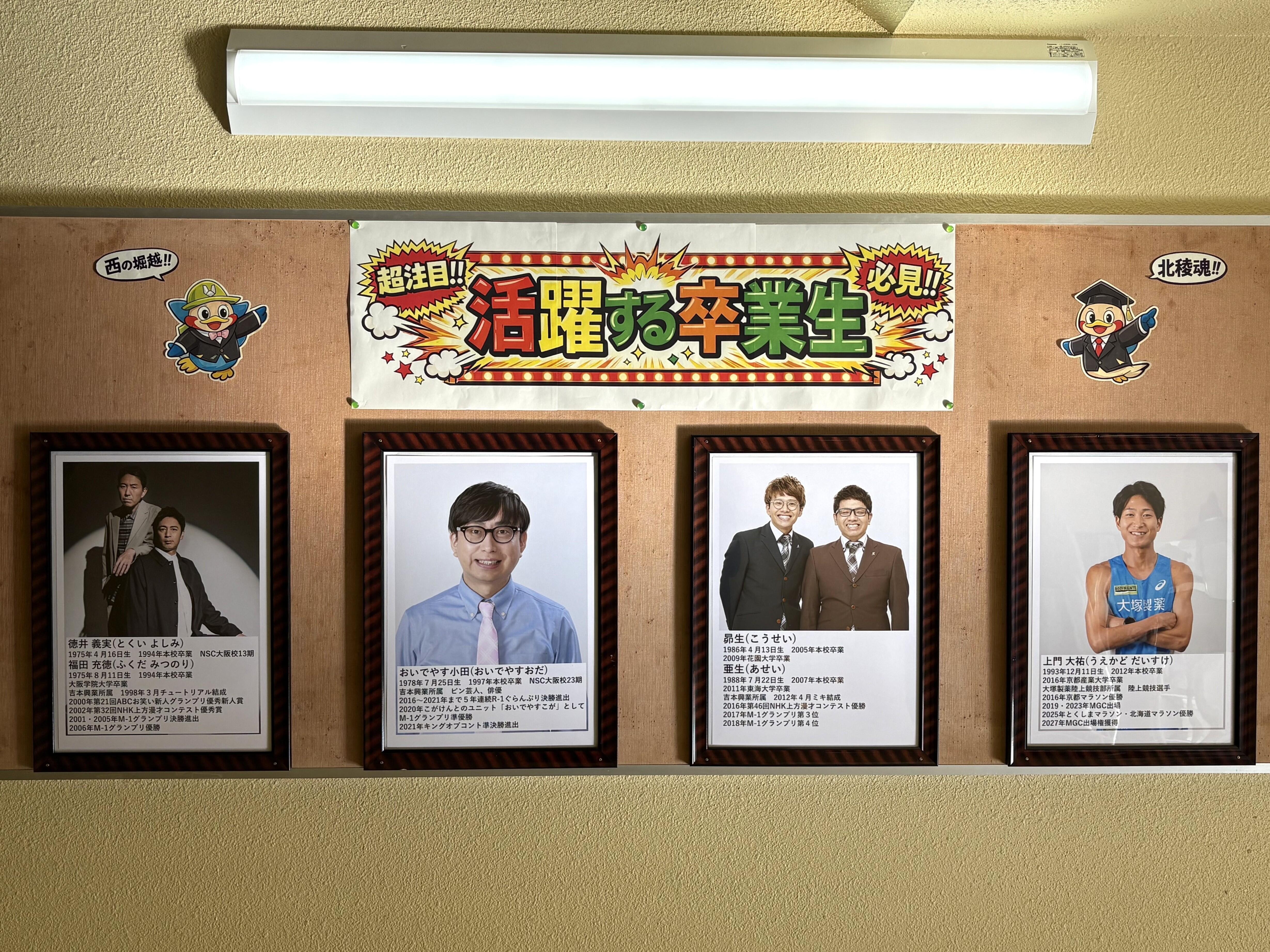 各界で活躍されている卒業生(チュートリアル徳井義実さん・福田充徳さん、おいでやす小田さん、ミキ昴生さん・亜生さん、上門大祐さん)をA棟の西側階段の1階で紹介しています。是非見てください!!