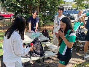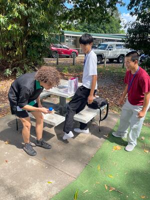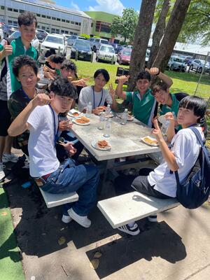 トリニティベイ高校では授業体験や、それぞれ用意した日本のお土産などを用いて交流していました。ランチ交流では、校内のいろいろなところで、バディと一緒にピザを食べました!